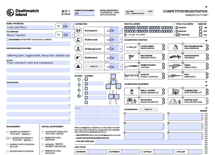 Deathmatch Island has another thing I like: disposable characters. They’re quick to make, and relatively easy to lose. That’s how I play most of my characters anyway – I only get attached to them after they’ve been through some shit – so this should be a good fit.