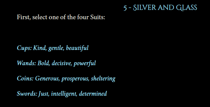 Next, I’m going to try a character for Descent in Silver and Glass, by Peach Garden Games. This is an unusual solo RPG in that it actually involves character creation. It’s also tarot-based, which is a great excuse for me to bust out a beautiful tarot deck I’ve been itching to use. And, because it’s a solo game, I can just go on and start a playthrough afterwards, without waiting for a group to coalesce.