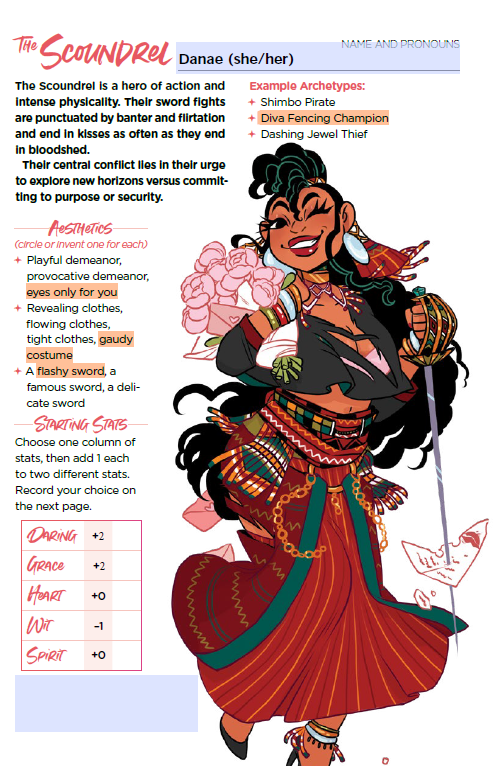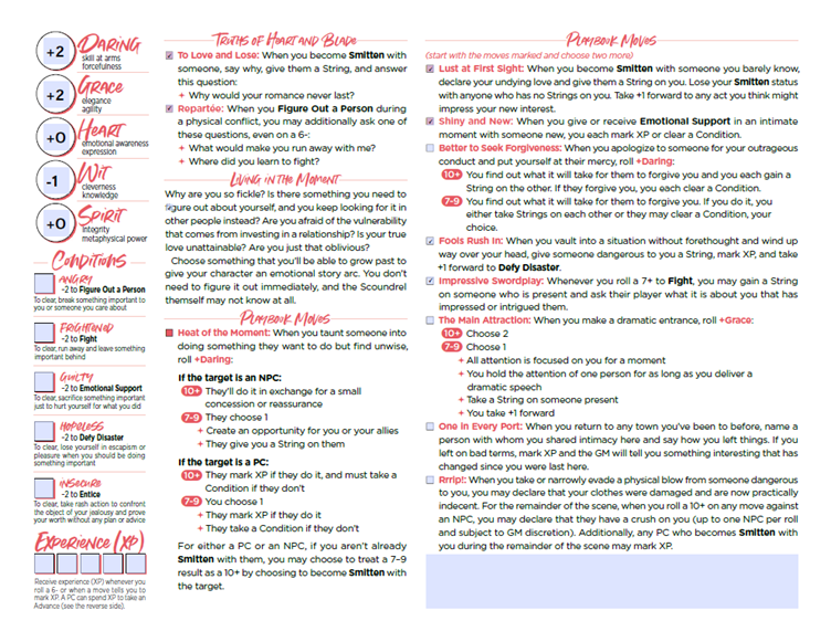 Each playbook comes with a summary of what the character does and their central conflict – the kind of stories they’re great at telling. I’m a creature of habit so I’m picking The Scoundrel: