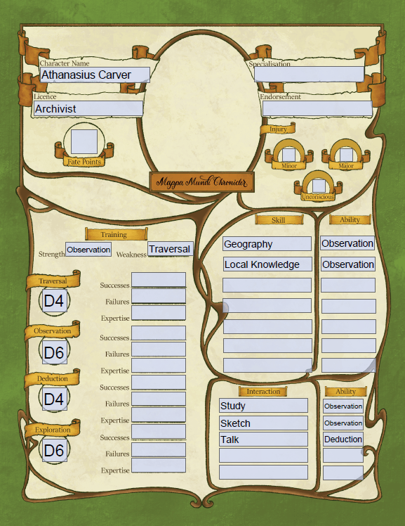 Because I’m an Archivist, Observation gets a D6 and Traversal gets a D4. I figure Athanasius is better at places than people, so the other D6 goes to Exploration and the last D4 goes to Deduction.