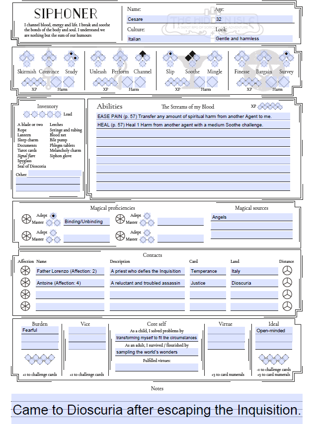 A couple of the games I’ve made characters for haven’t put a Notes section on the character sheet, and I have always needed one, so I’m pleased that it’s here and also that Hidden Isle wants me to use it to record my origin.