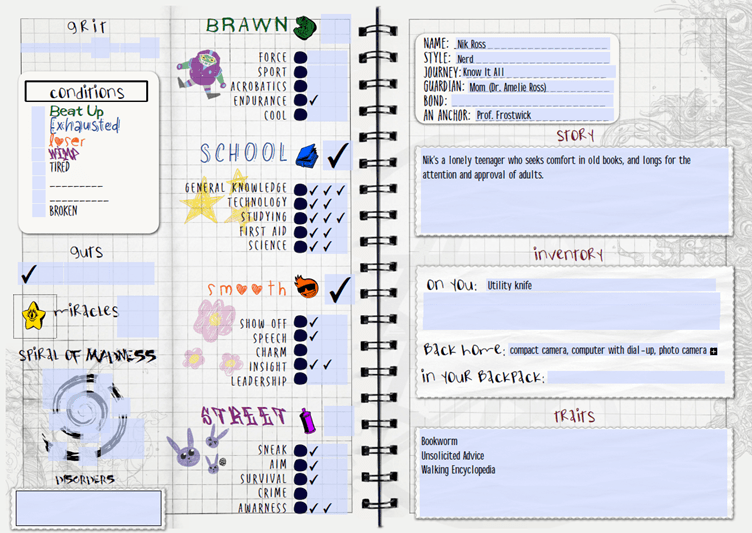 The game suggests adding a Dark Secret at this stage. Nik’s is that they once cursed a bully using a spell in an old book they found in the library – which has now disappeared. It worked: they ruined the guy’s football career.